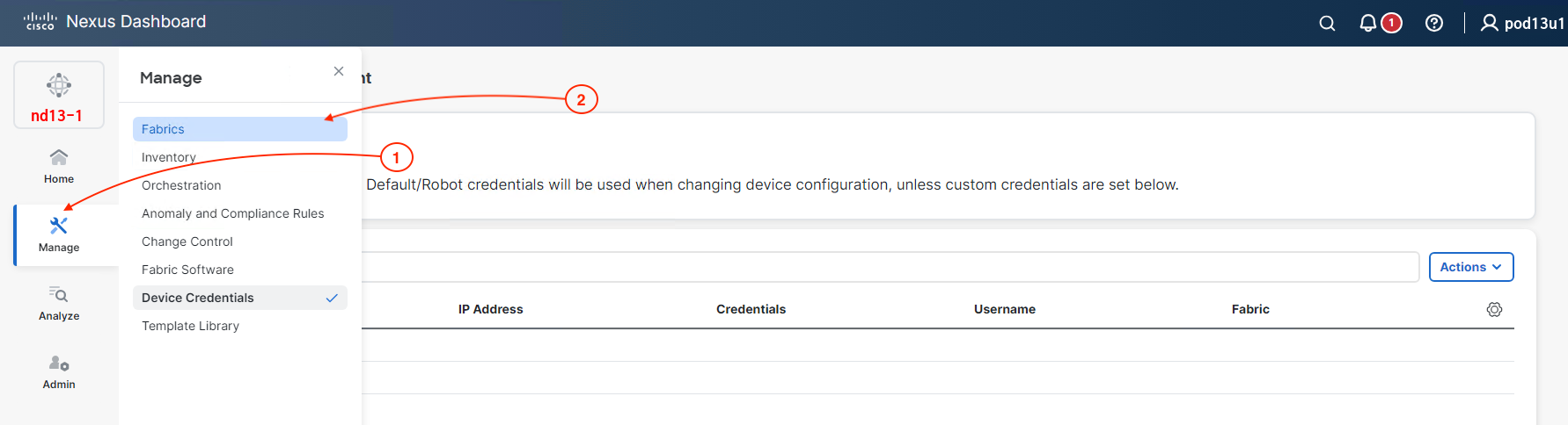 Navigate back to your Site1 fabric (You could leverage the Manage Icon on the left naviagtion bar to go back to the list of fabrics):