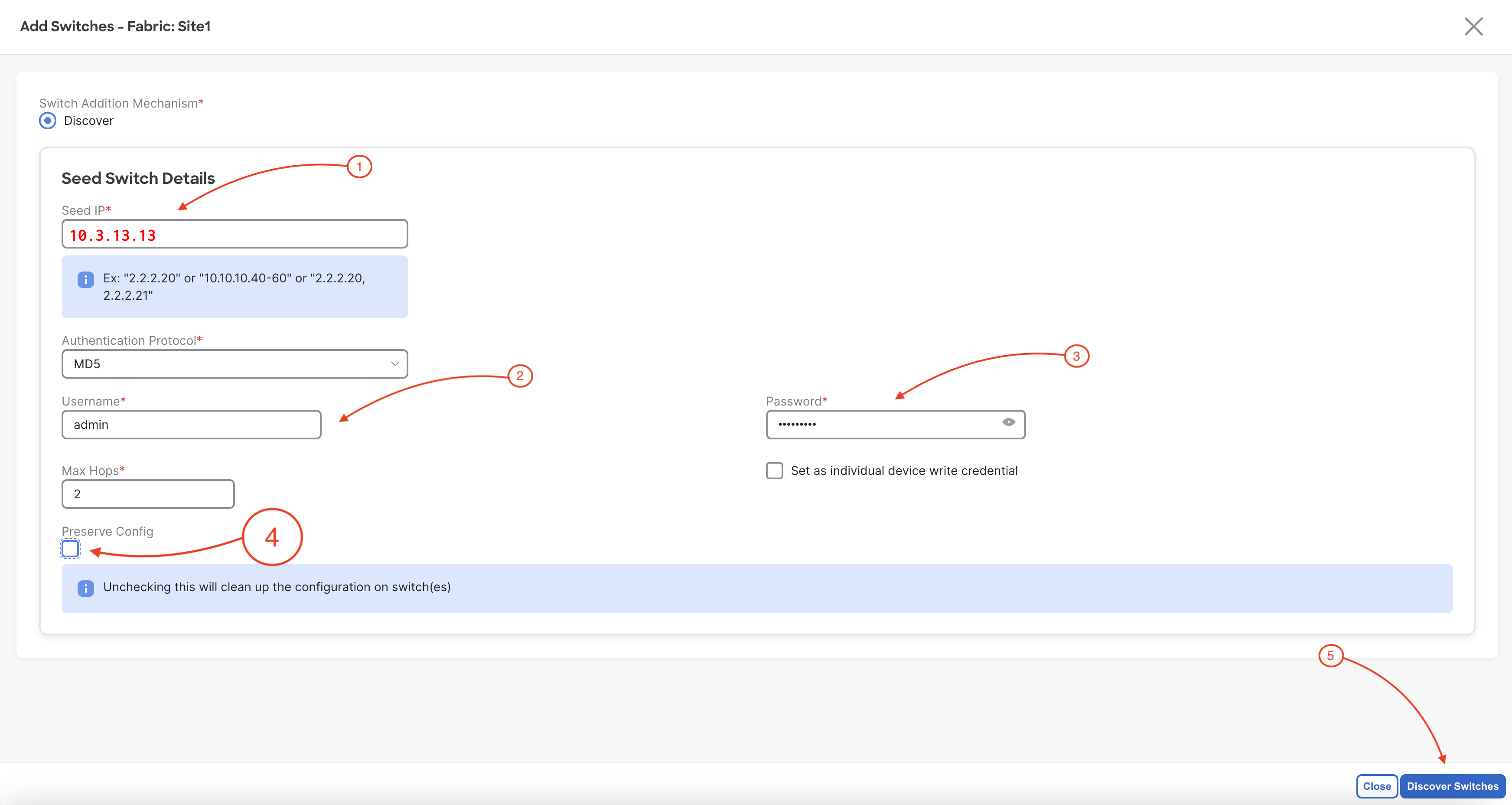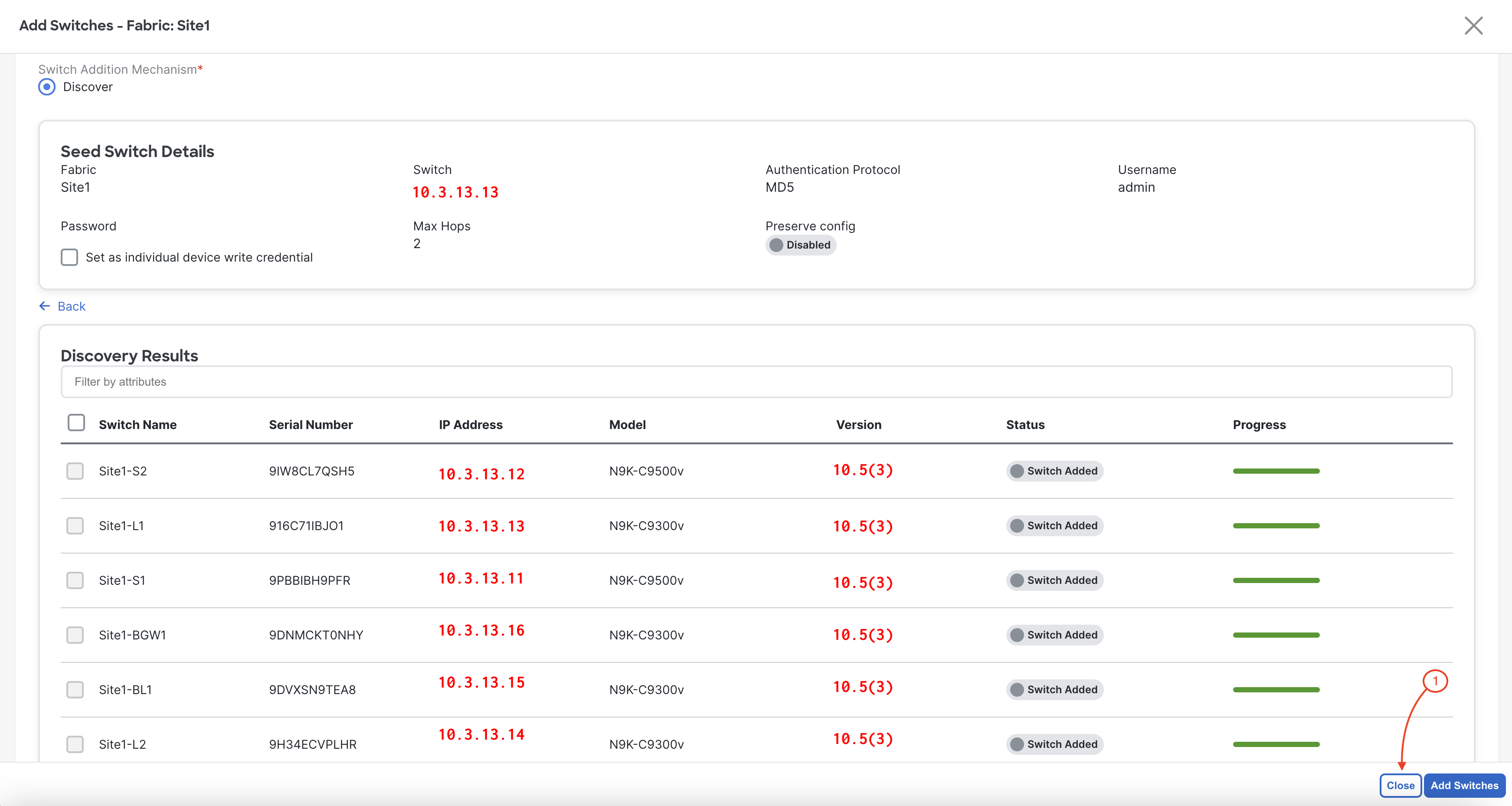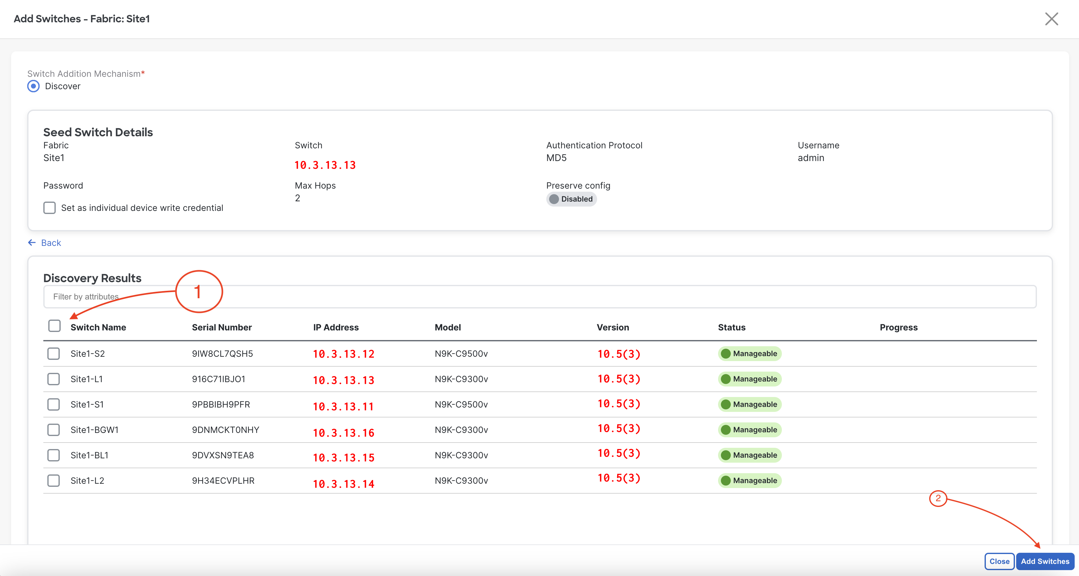 You will now use these steps to discover and import switches into your Site1 Greenfield fabric.