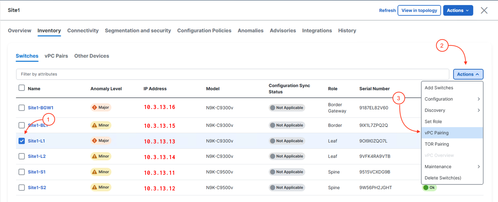 Site1-L1 and Site1-L2 are now set to be configured as vPC peers (VPC Pairs) as shown by the Pending status in the Config Status column: