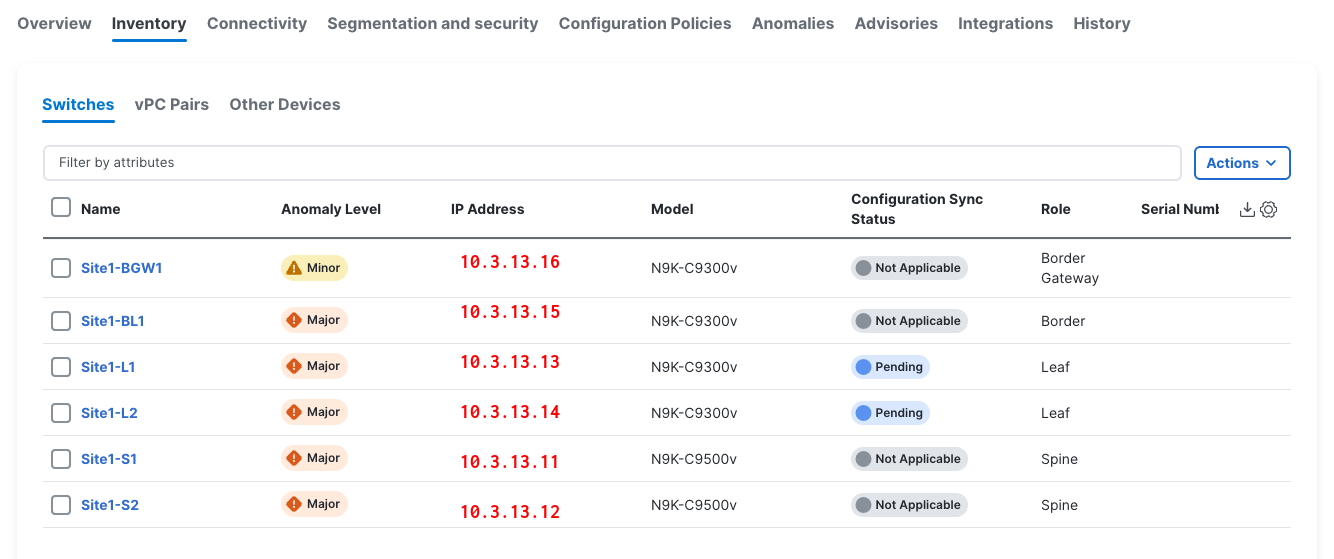 You should still be at the Switches tab. From the Switches tab, you can create vPC pairs between switches simply by working with only one of the switches in the pair. NDFC automatically detects pairs for you.