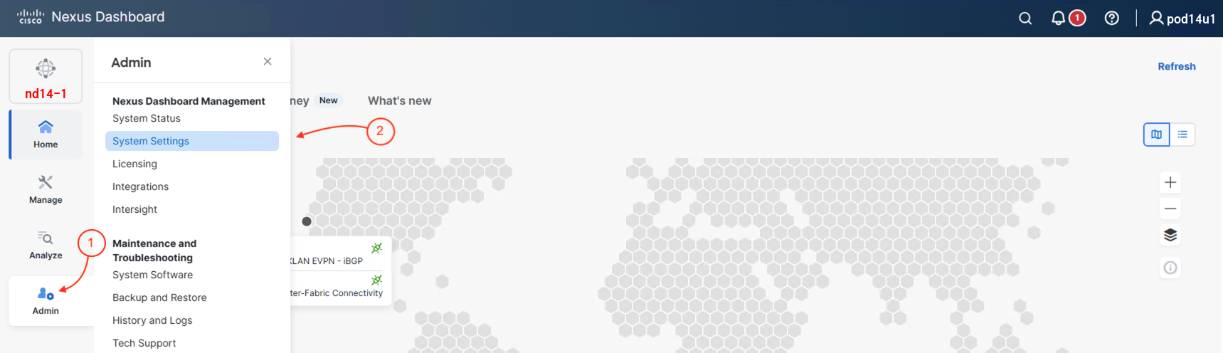 In this step, you will configure the primary Nexus Dashboard (ND) cluster. For this lab exercise, the designated primary cluster is nd14-1.