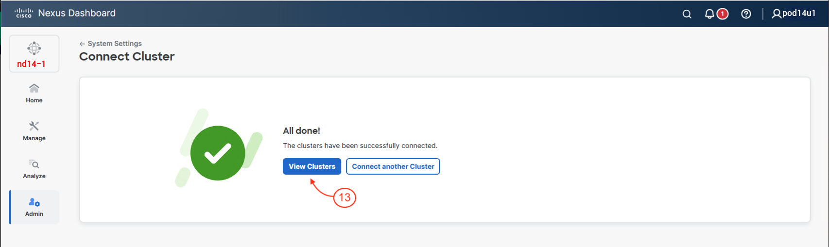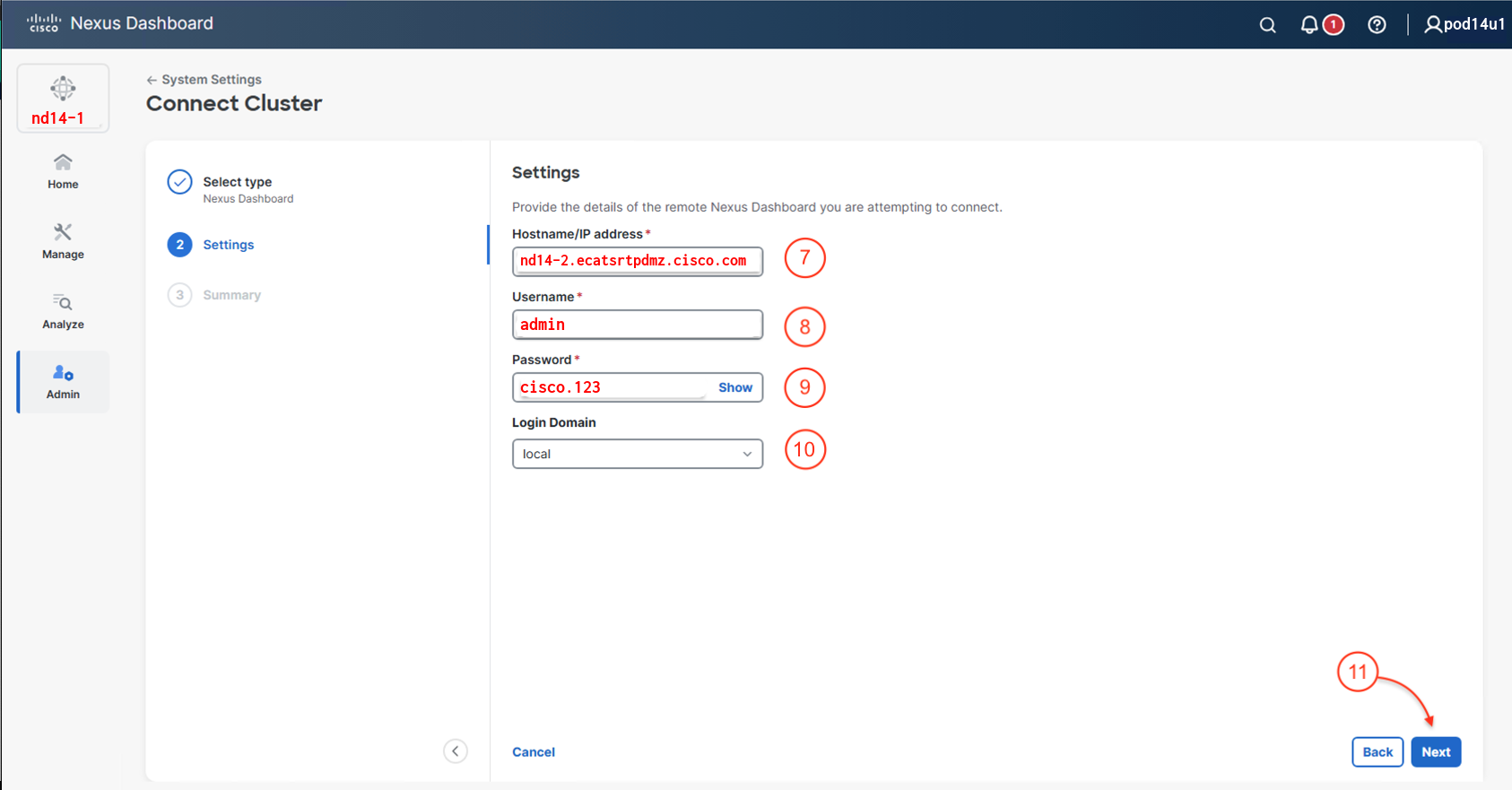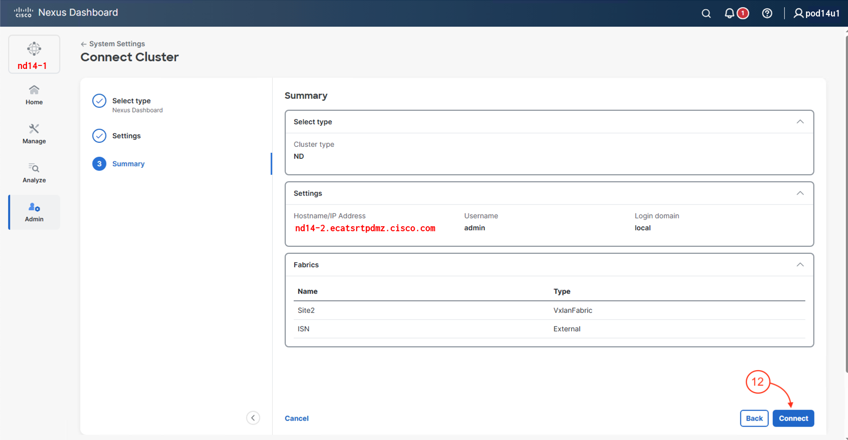 In this step, you will add the second Nexus Dashboard cluster, nd14-2, to the multi-cluster environment to enhance centralized management and scalability.