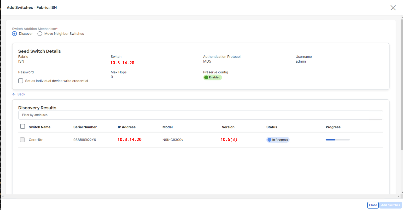 You imported the Core-Rtr into the ISN fabric using the same familiar discovery workflow. Nexus Dashboard's consistent approach across all fabric types — VXLAN, External L3, and ISN — means there's only one process to learn for onboarding any device in your network.