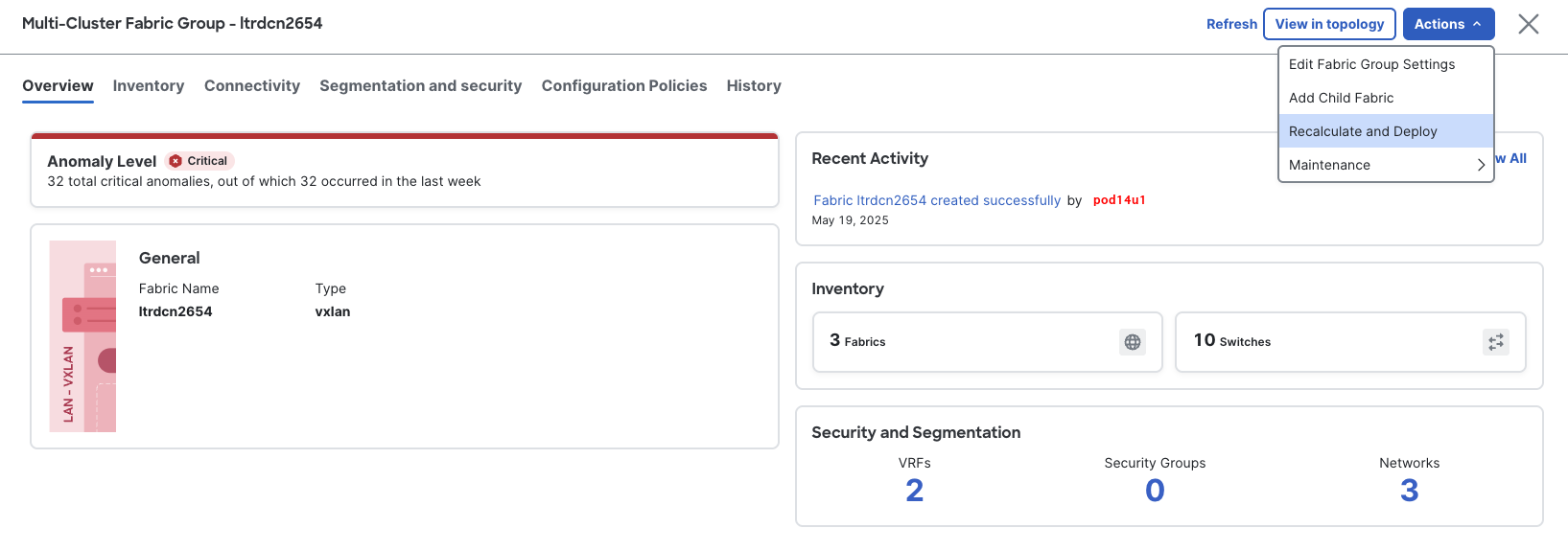At the top right of the Multi-CLuster fabric, locate the fabric-level Actions button: