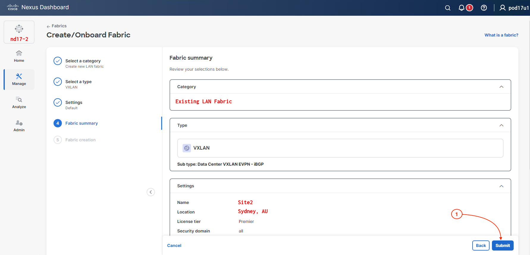 Like the Greenfield fabric you created, you will create the same type of "Data Center VXLAN EVPN". When creating the Site2 fabric, you must ensure the