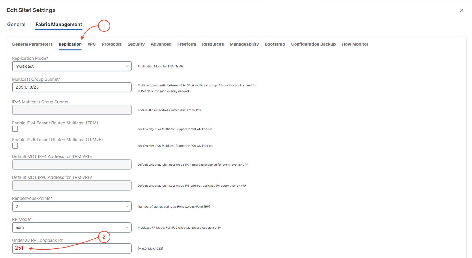 The second section is Replication parameters where you define whether the fabric will use multicast or ingress replication for BUM (Broadcast, Unknown Unicast, and Multicast). You will use multicast for this lab. Again, you will leverage various defaults already adhering to best practices, such as having two (2) Rendezvous-Points (RPs), but will set the parameter for RP Loopback identifier to make it specific to your Site1 fabric:
