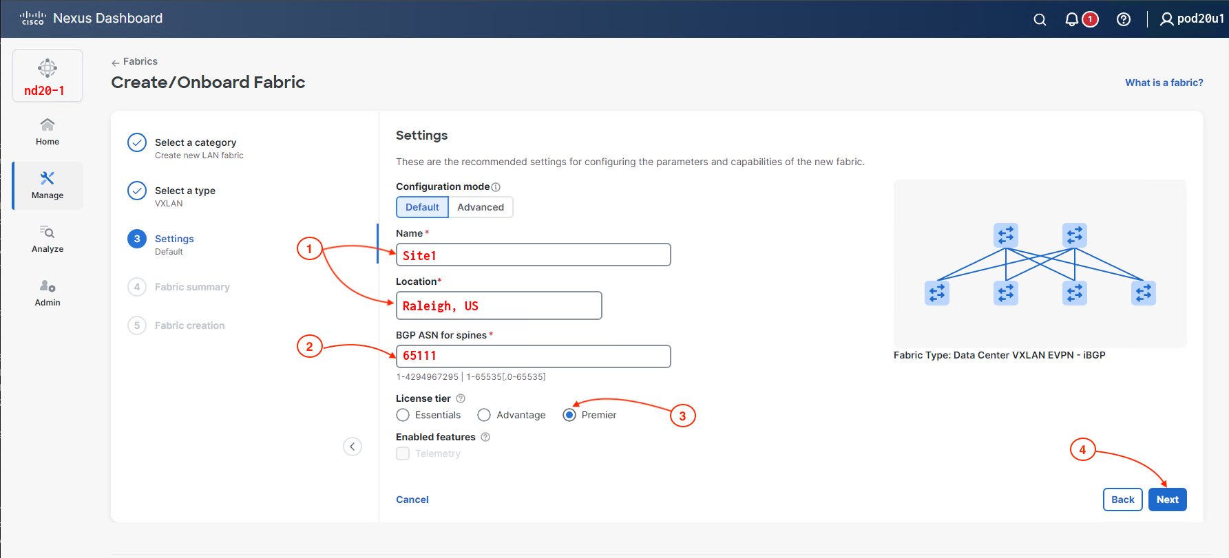 These settings form the foundation of your Site1 fabric. Nexus Dashboard will use them to automatically generate and push best-practice configurations to every switch you add in the next section.
