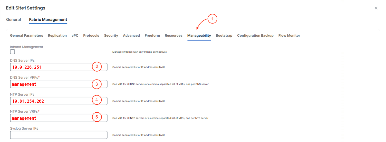 The last section to update in this lab is the Manageability parameters that defines the DNS, NTP and syslog servers and how to reach them. These configurations apply to all the switches in the fabric. Use the information below to set the IP range for each: