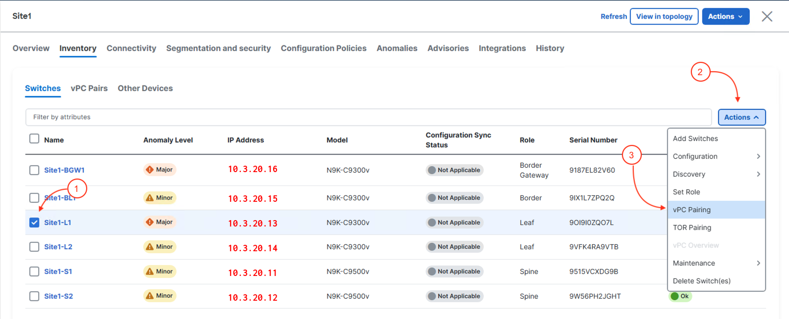 Site1-L1 and Site1-L2 are now set to be configured as vPC peers (VPC Pairs) as shown by the Pending status in the Config Status column: