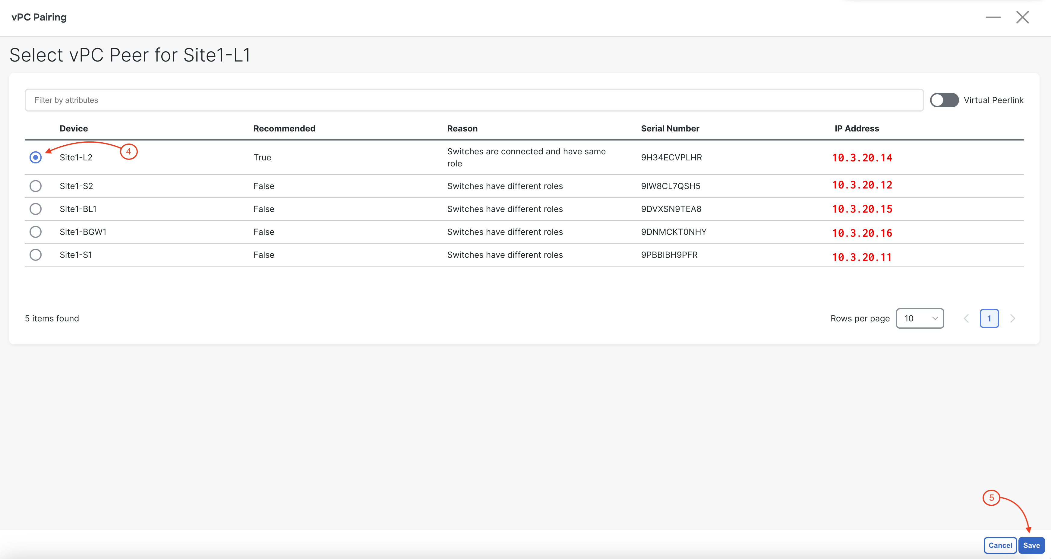NOTE: Site1-L2 shows as set to true and the only recommended switch capable of being a peer because it is connected to Site1-L1