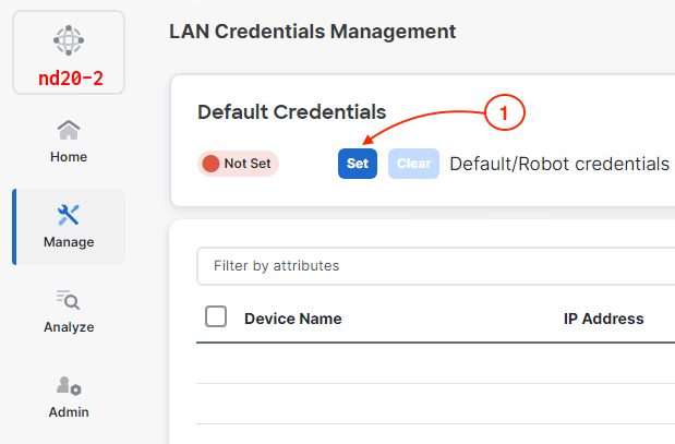 Default Credentials should be set per user which means each user will need to set Default Credentials when they first login to ND, otherwise configuration deployment to switches will fail. However, if a user would like to use a single account for all users that has the network admin role to deploy configuration to switches, the Robot option can be selected. If this option is selected, all configuration deployed from ND will show as deployed by this robot user, no matter which ND user triggers the deployment. In this lab, as we only have one user, you will use the admin user for Default Credentials without the robot option. To set it, in the Set credentials popup, input: