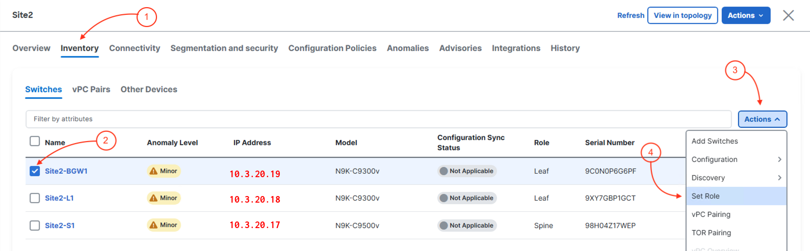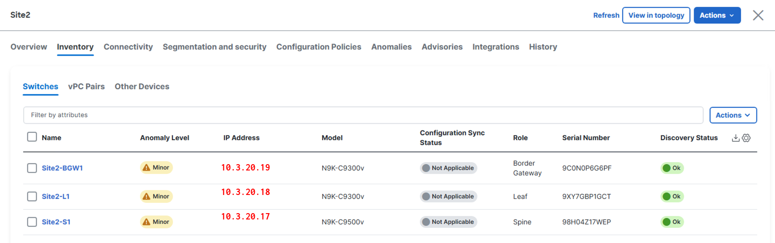 You assigned the Border Gateway role to Site2-BGW1, just as you did for Site1. Nexus Dashboard automatically detected the Spine and Leaf roles during discovery. The same role-based approach works identically across Greenfield and Brownfield fabrics — ND provides a unified management experience regardless of how the fabric was originally deployed.