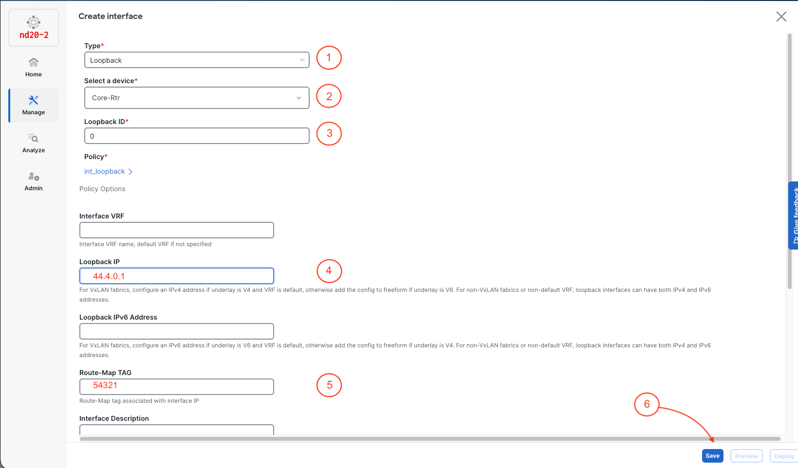 You created a loopback interface on the ISN core router that will serve as the Route Server endpoint for Multi-Site EVPN peering. Nexus Dashboard's interface wizard makes it easy to provision loopbacks with the right IP and route-map tags without touching the CLI.