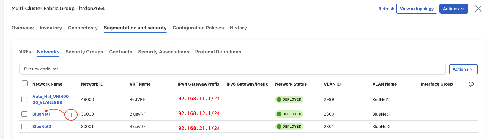 In your Multi-Cluster fabric, navigate to Networks to attach your BlueNet1 Network to Site2-L1.