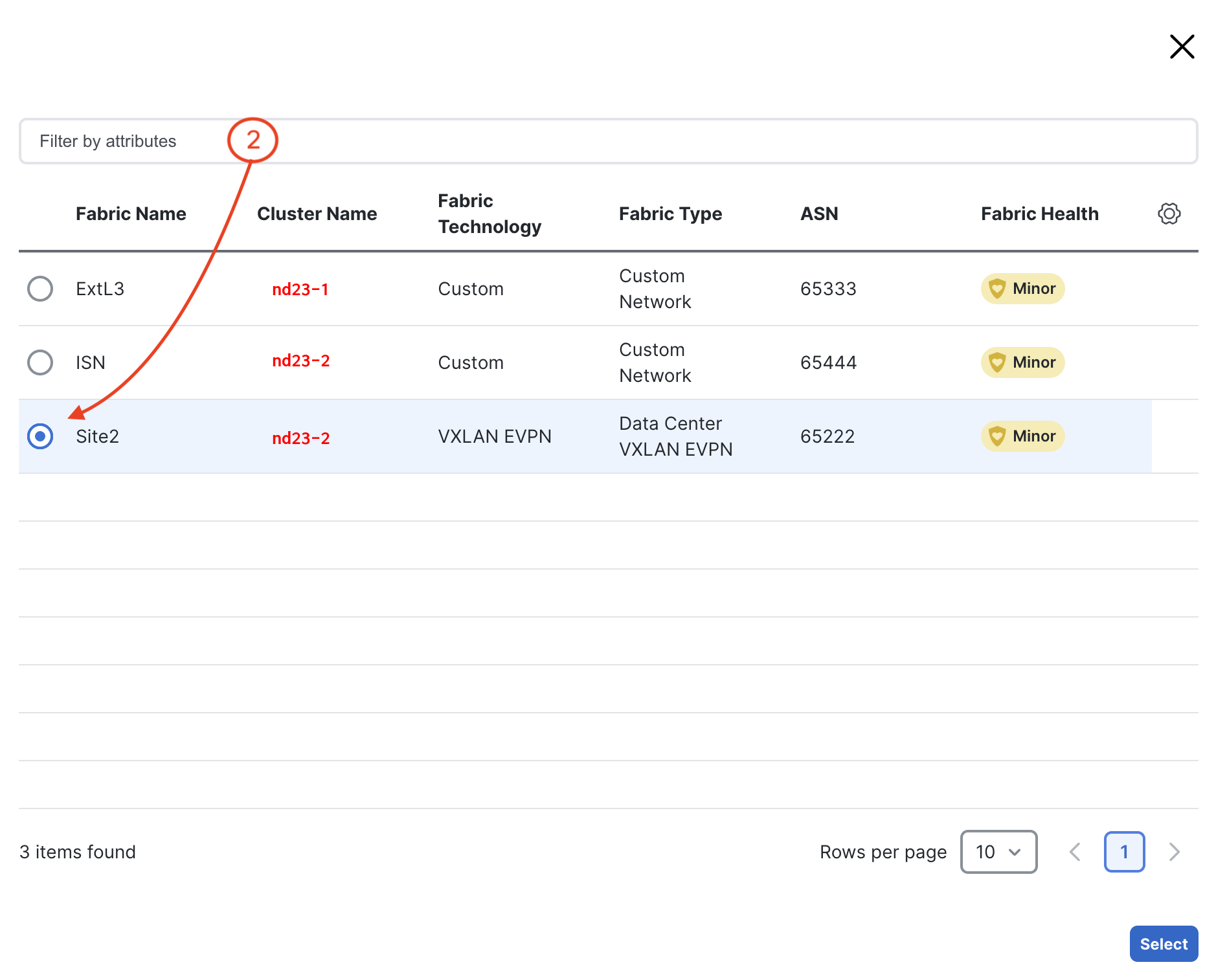The second fabric you want to select and import is your Site2 fabric. Locate Site2 in the list of fabrics and notice the fabric list has shortened since Site1 was previously selected.