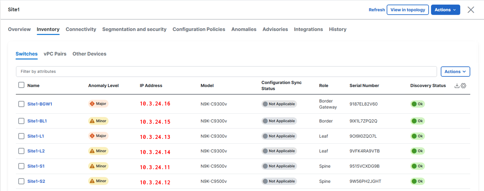 Review the switch roles that were automatically assigned by NDFC and the roles you set. Again, each switch role will serve a purpose in the type and amount of exact configuration required to be deployed to a given switch.