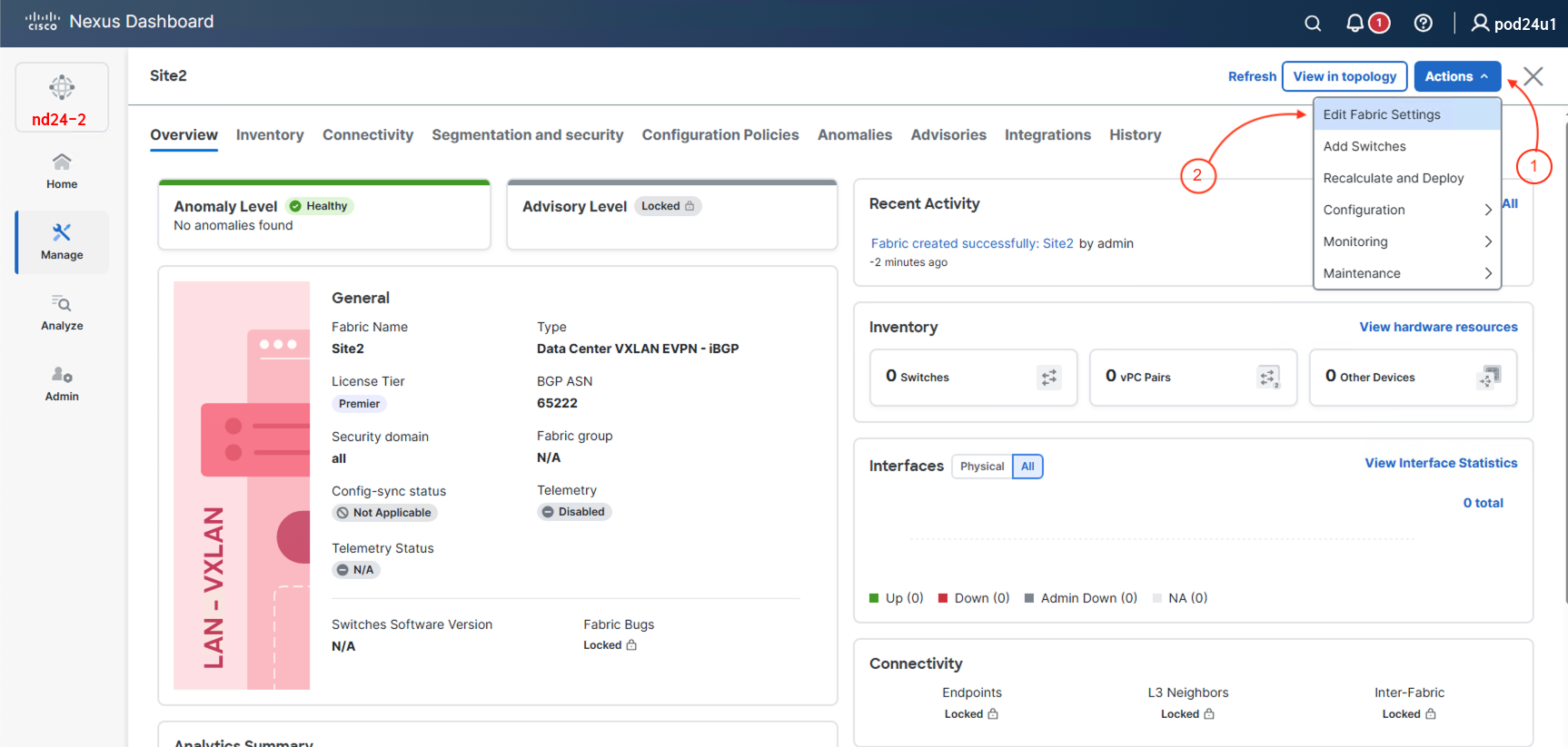 With your Greenfield fabric created and deployed, your focus is now toward your Brownfield fabric. This will be your Site2 fabric.