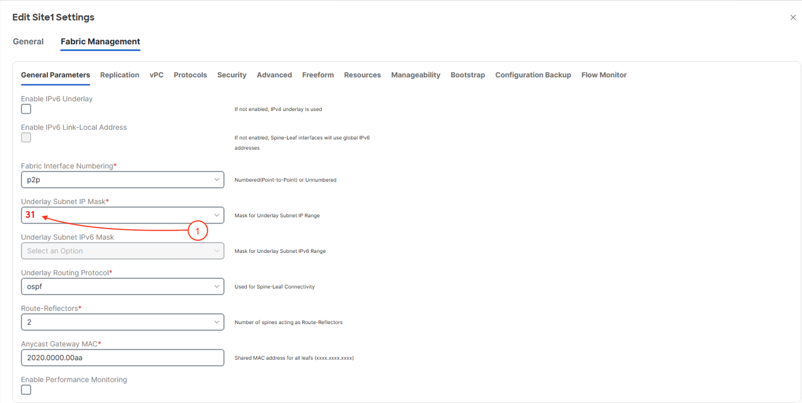 - Set the Underlay Subnet IP Mask to 31 for point-to-point