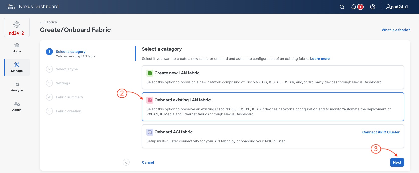 Continue to the next section to discover and import your Brownfield fabric switches into your Site2 fabric.