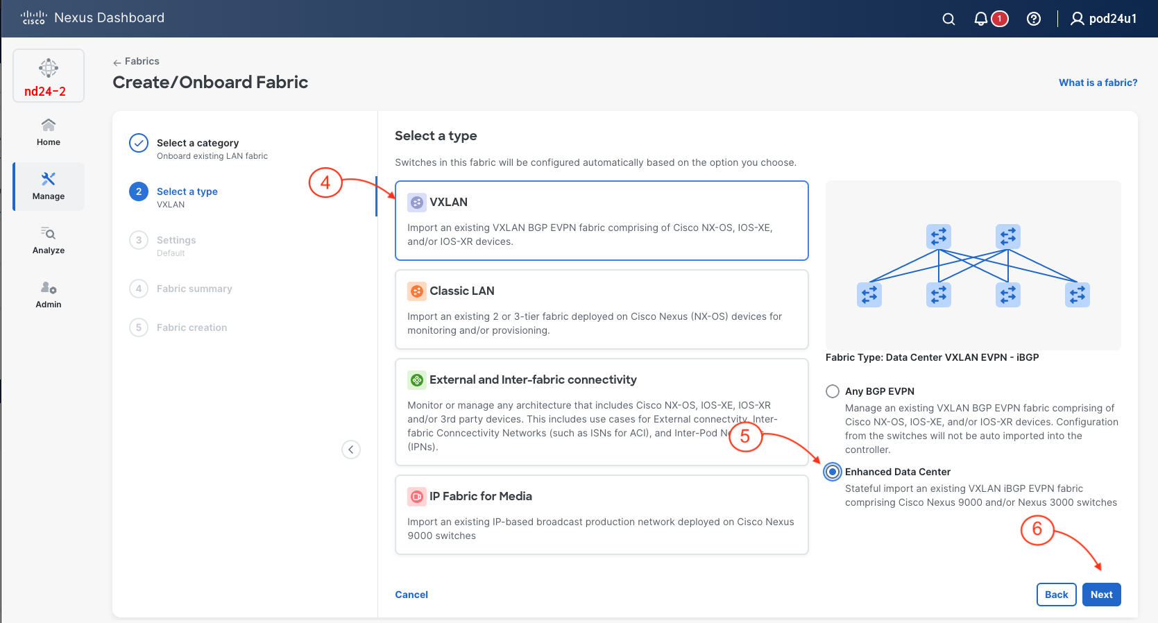 Like the Greenfield fabric you created, you will create the same type of "Data Center VXLAN EVPN". When creating the Site2 fabric, you must ensure the