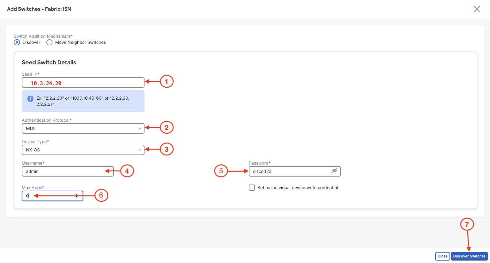 The Add Switches Wizard needs some information to automaticaly be able to discover and add your external device for management by Nexus Dashboard.