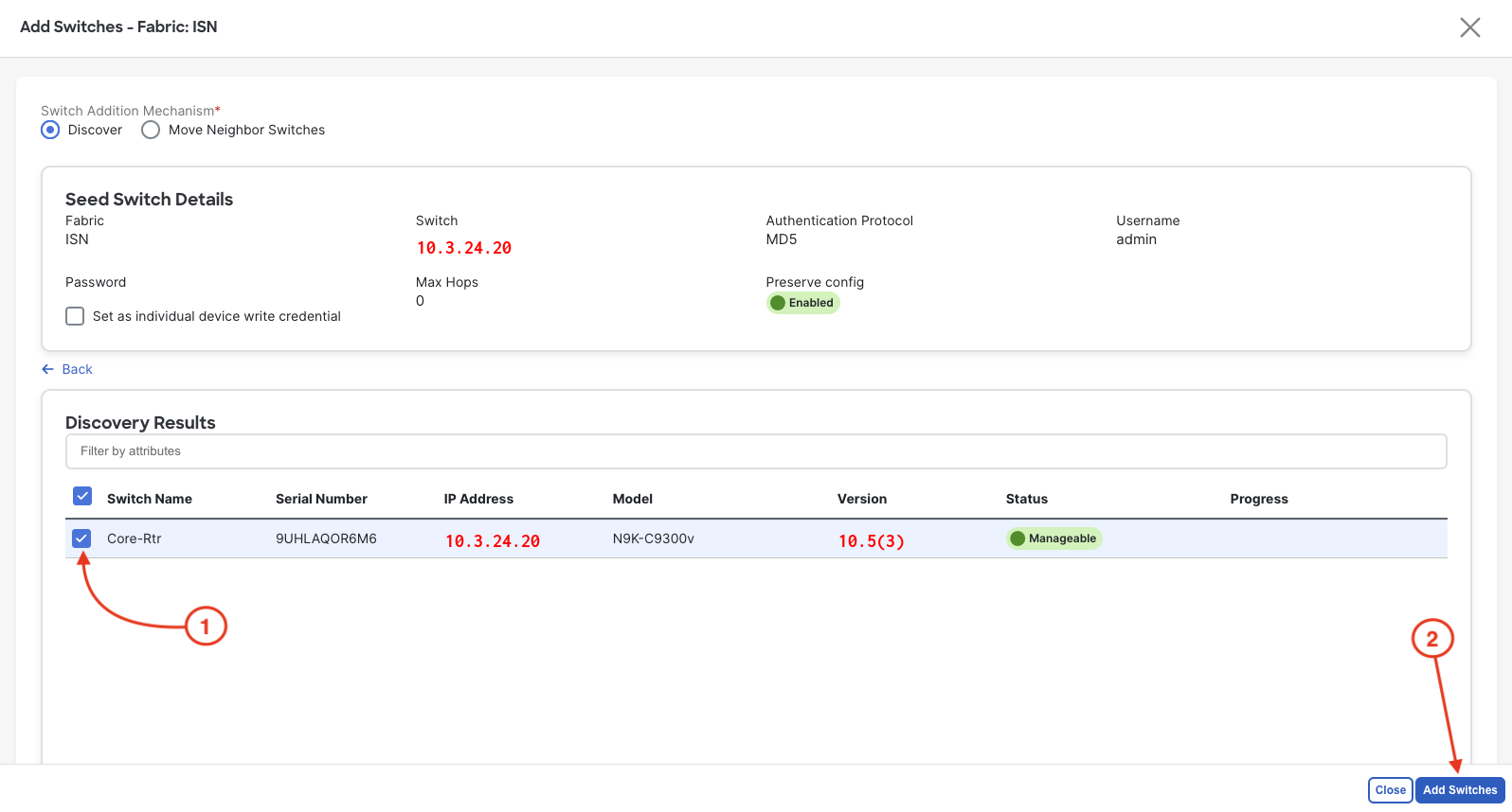 You imported the Core-Rtr into the ISN fabric using the same familiar discovery workflow. Nexus Dashboard's consistent approach across all fabric types — VXLAN, External L3, and ISN — means there's only one process to learn for onboarding any device in your network.