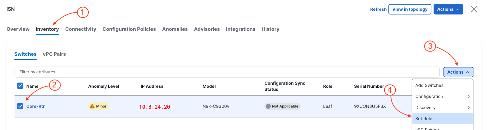 You set the Core Router role on the ISN device. This role tells Nexus Dashboard that this device serves as the inter-site transport, and ND will configure it accordingly during deployment to enable Multi-Site connectivity between your data centers.